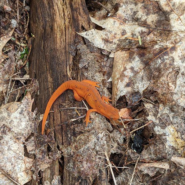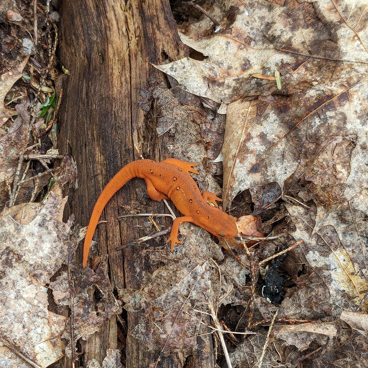 Another cold-blooded creature that brightens up the spring forest is the eastern newt (Notophthalmus viridescens) – specifically the juveniles known as red efts. Adults are aquatic and breed from late winter to early spring. Gilled larvae transform into terrestrial juveniles – efts – which are bright orange with spots. Efts are easy to spot after spring rains and can live on land for many years before returning to the water as adults.