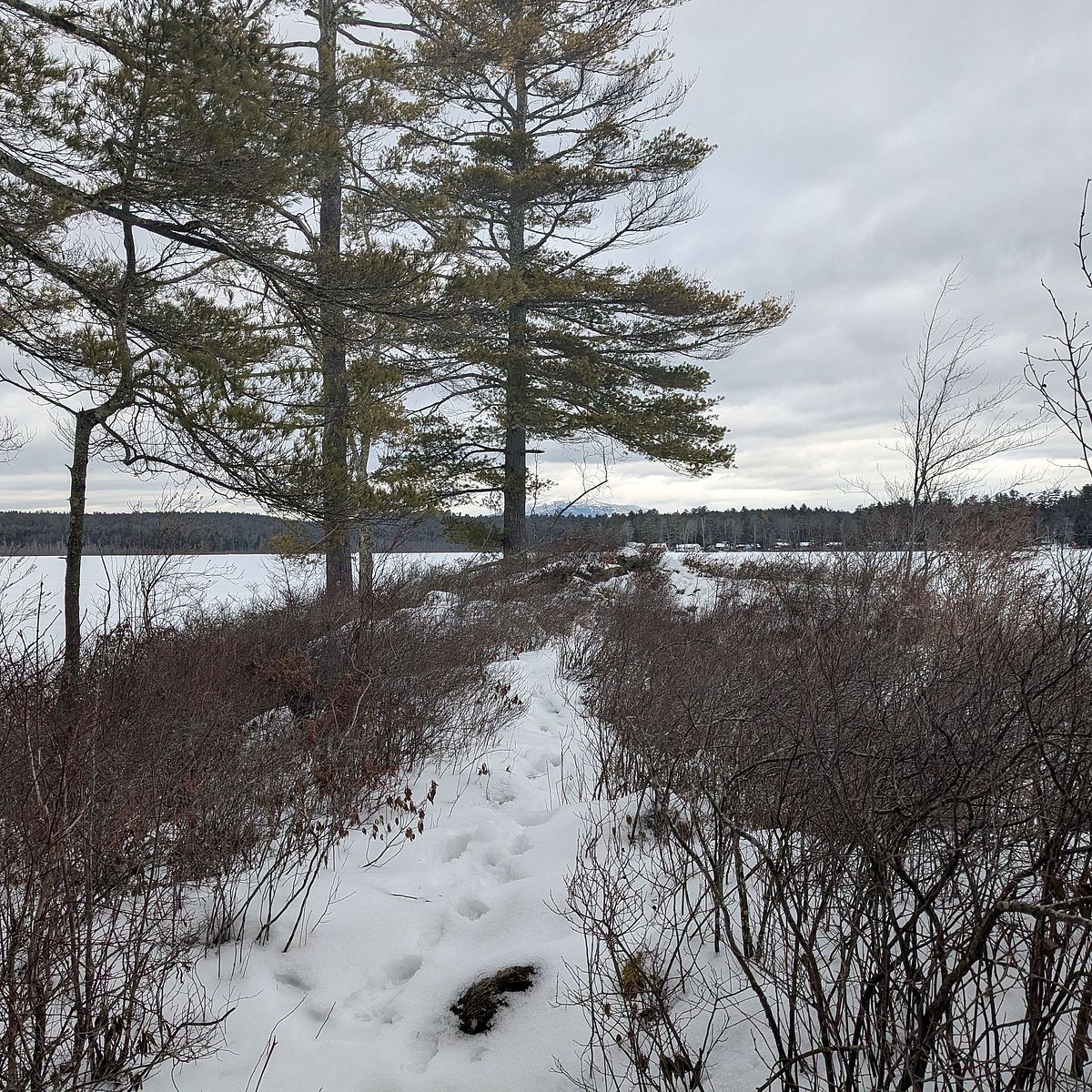 The 234-acre reservoir is easily accessible from a short trail that leads downhill from the parking area. From here you can walk across the reservoir if conditions allow – NH Fish and Game recommends at least 4-6 inches of ice for foot travel. On my visit I walked the pond and returned via the trail. Alternatively, you can follow the Gramwick Trail which leads from the kiosk out and back. The trail is relatively flat and meanders along the shore of the reservoir and includes several short boardwalks.
